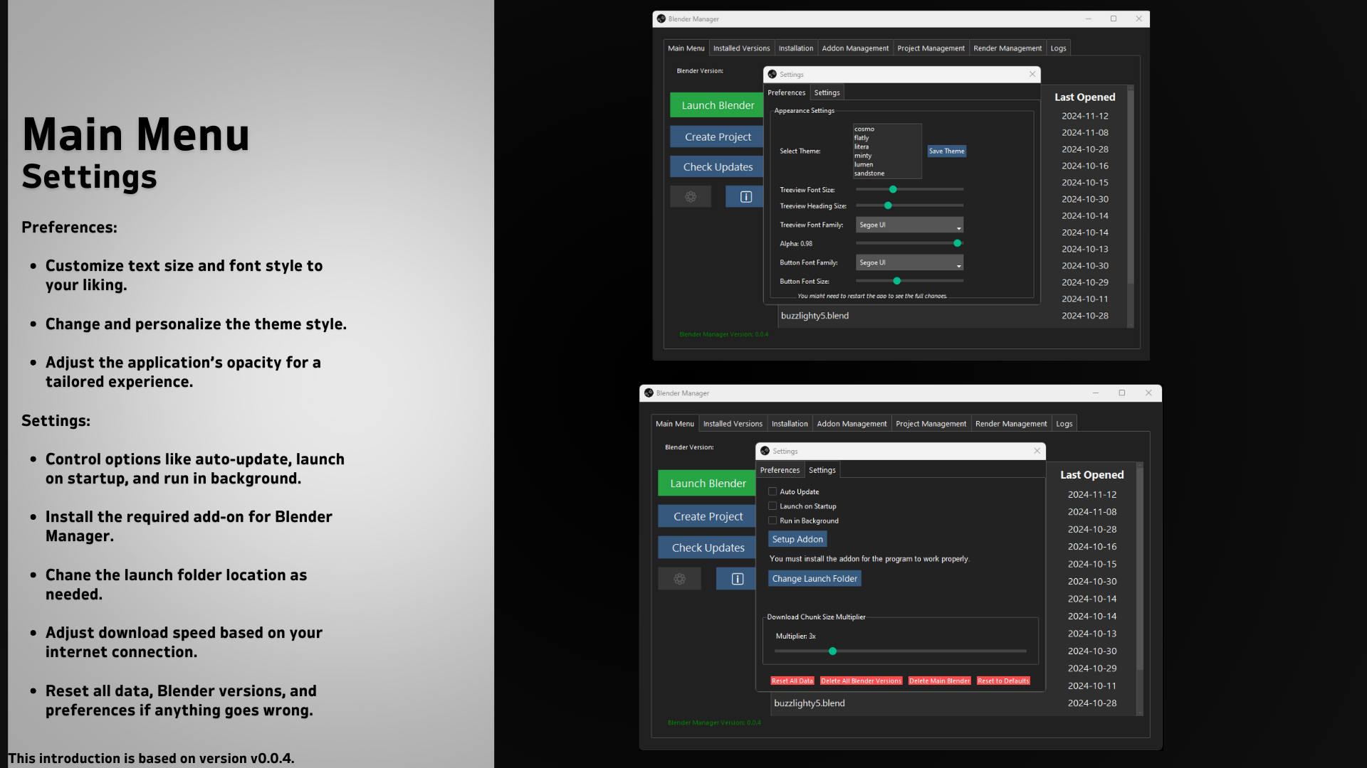 Includes an Auto Update feature, ensuring both the Blender application and Blender Manager itself are always up to date. The app automatically checks for the latest releases and offers a simple one-click update option.