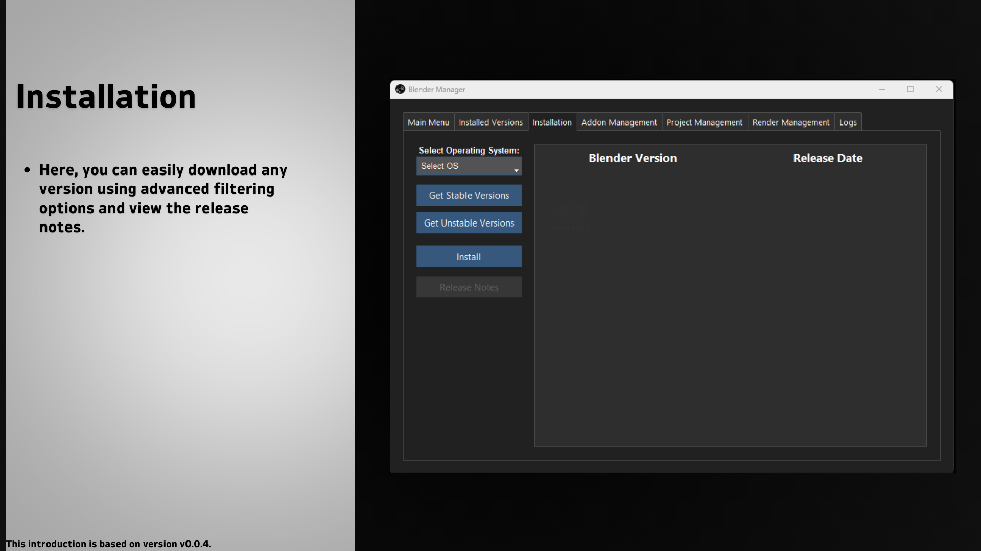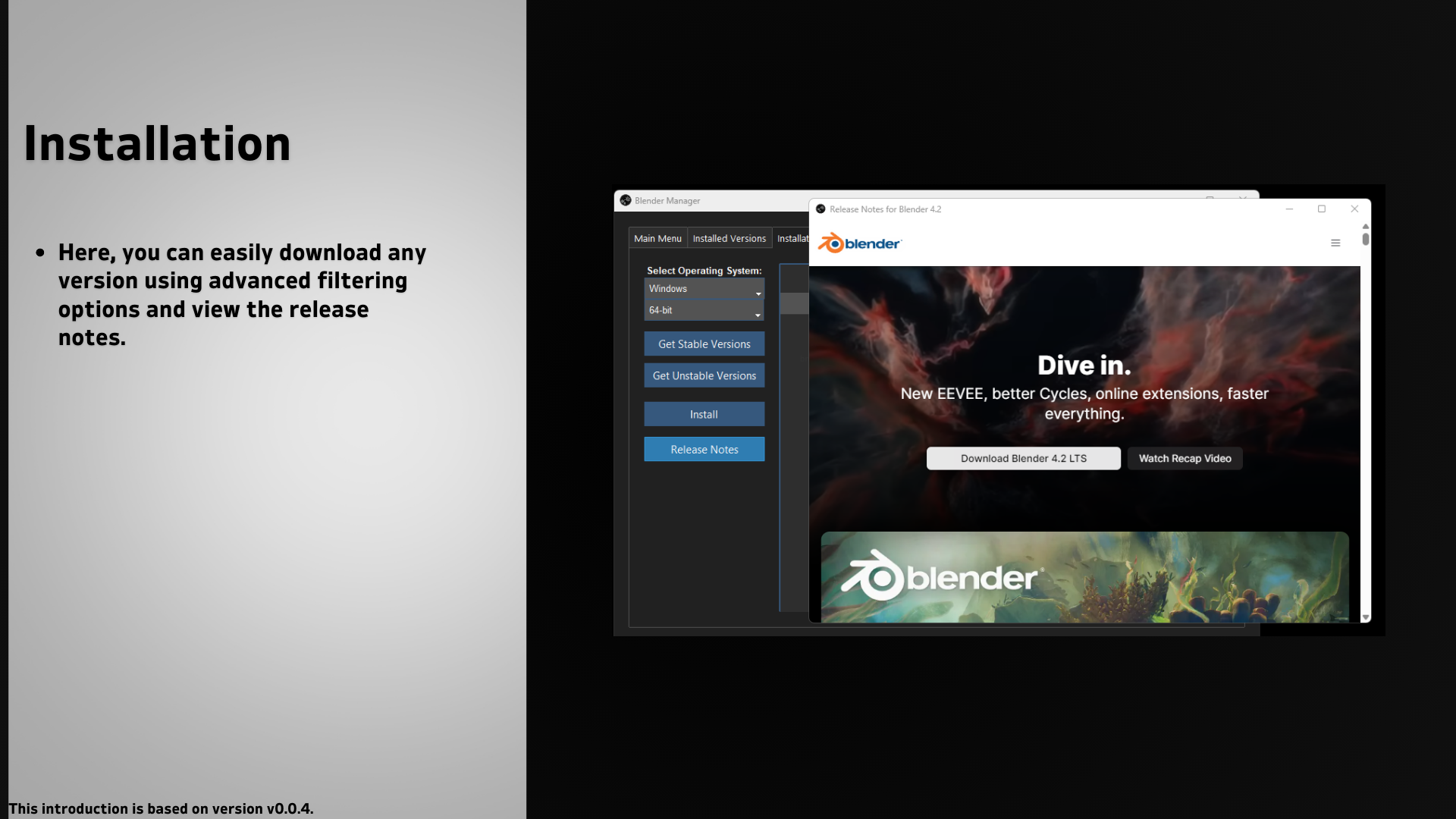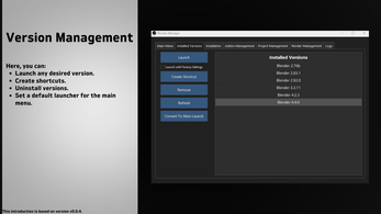 Manage multiple Blender versions effortlessly. Install any version you need, switch between them, or set a specific version as the Main Launch Version.