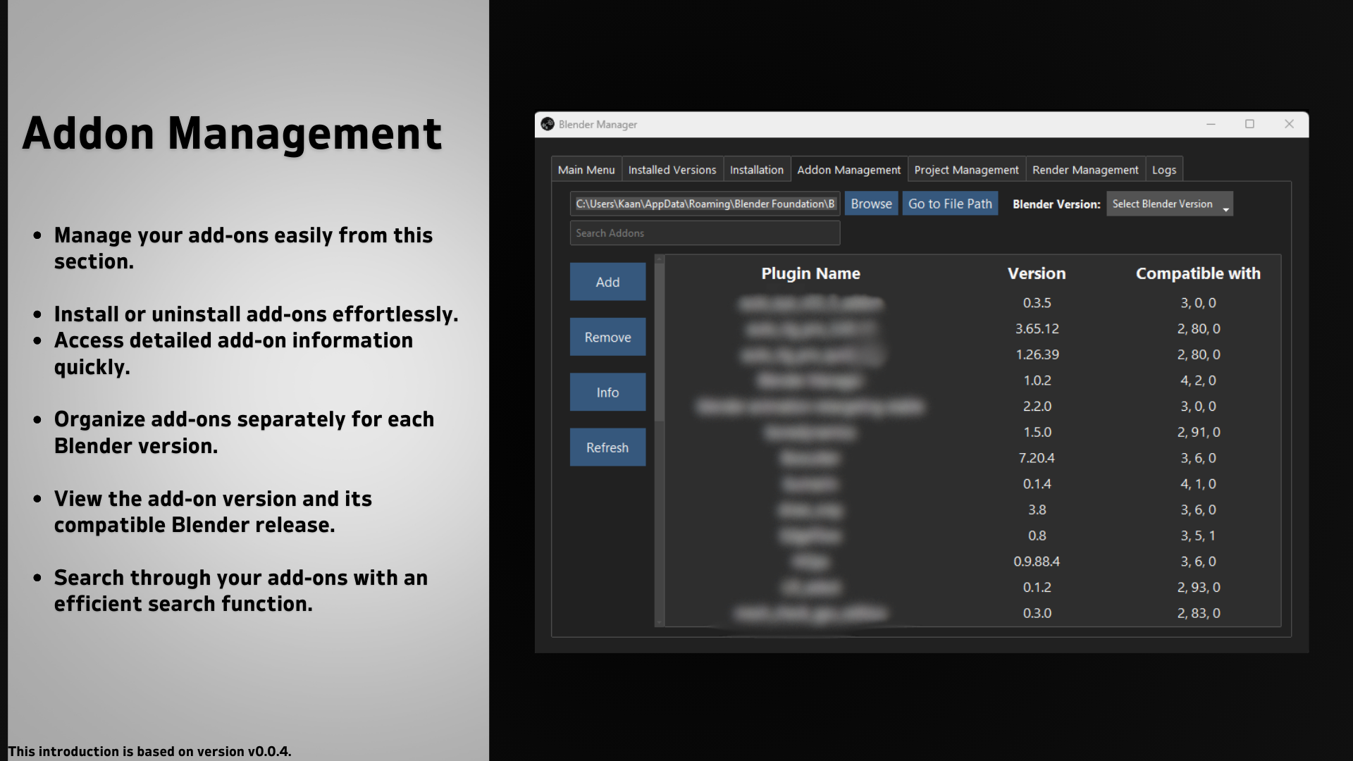 Provides an intuitive Addon Management tab to handle Blender addons efficiently. Key features include: